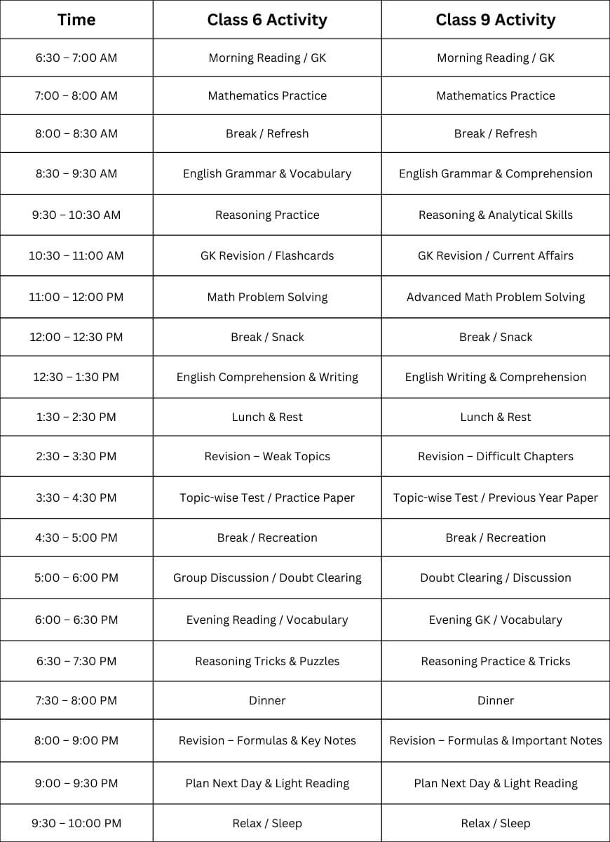 A 7-day schedule for those who really want to join RMS, students need only regular study and cover the syllabus before the exam. Here’s a sample 7-day study plan for Class 6 and 9 aspirants: