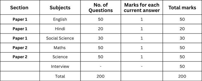 Syllabus: for class 6th, total 4 subjects as language, Math, Intelligence and general knowledge, based on Class V CBSE Syllabus. For class 9th, a total of 5 subjects are English, Math, Intelligence, General Science and Social Science, based on Class VIII CBSE Syllabus. Each subject carries its own weightage.