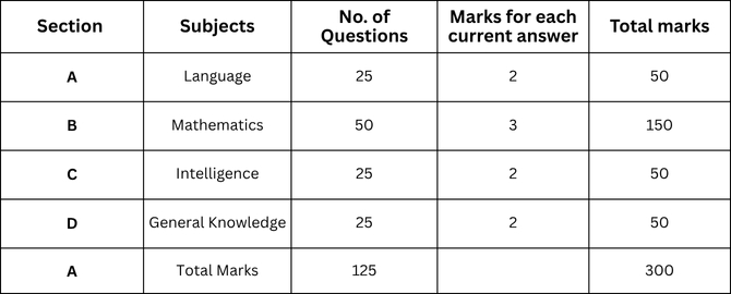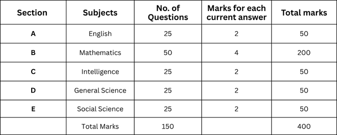 Syllabus: for class 6th, total 4 subjects as language, Math, Intelligence and general knowledge. For class 9th, a total of 5 subjects are English, Math, Intelligence, General Science and Social Science. Each subject carries its own weightage.